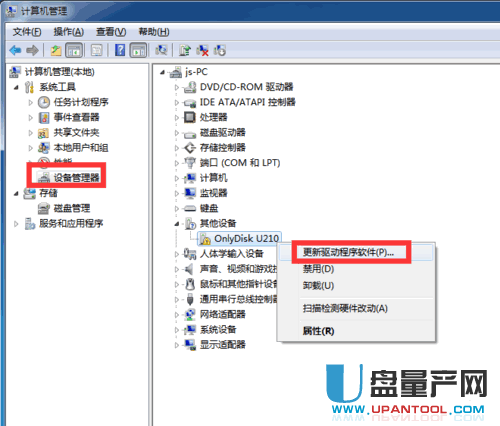 从打开的“计算机管理”窗口中,展开“设设备管理器”,找到未正常识别的U盘标识,右击选择“更新驱动程序软件”项。
