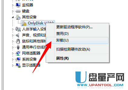 如果不行,我们还可以右击无法正常识别的U盘,从其右键菜单中选择“卸载”项,将之前的U盘驱动卸载掉。
