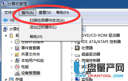 接着点击“操作”菜单,从弹出的下拉菜单中选择“扫描检测软件更动”项,以自动扫描并识别U盘并安装驱动程序。