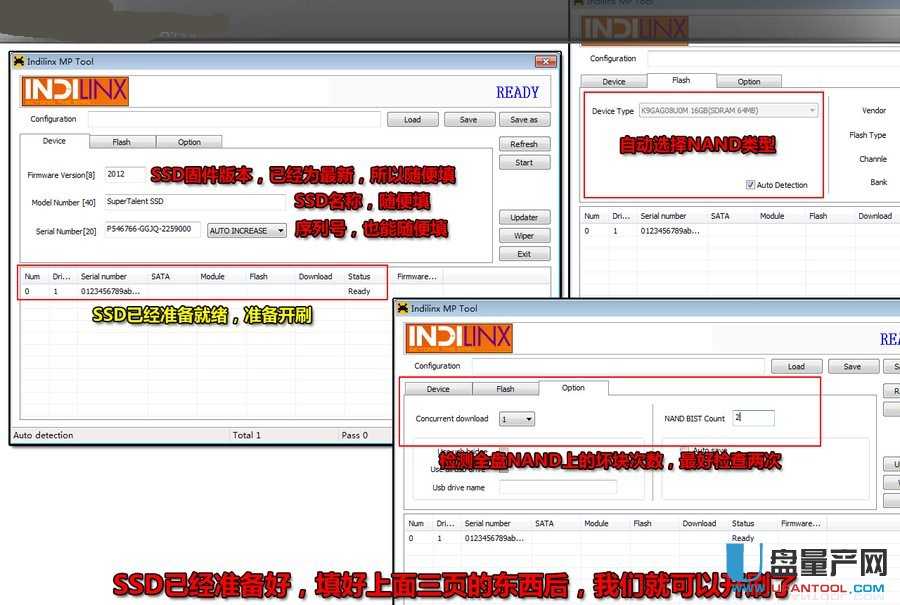 量产工具打开后,如上图,device类里可以看到ssd固件版本填2012,ssd名称随便填写,序列号也可以随便填写。flash类型里我们勾选AUTO detection让量产工具自动识别。option类里填写检测坏块的次数,最好填次,前面的download选1。填完后就可以开始刷了。