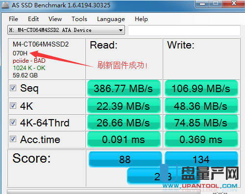 固件升级成功,可以用AS SSD Benchmark查看到新固件的版本号。