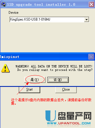 4、然后插入U盘,盘符位置选你的U盘,别选错了,然后点击start,点是。
