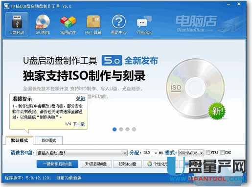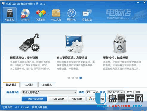 运行电脑店,插入U盘,选择U盘,点击“一键制作启动U盘”,记得要备份U盘里的数据,制作过程中将会全盘格式化U盘里的数据。
