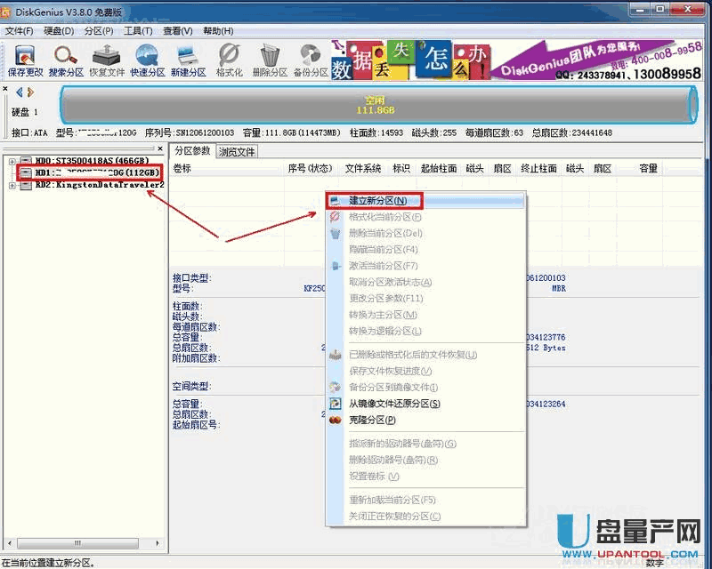 进入PE后点击开PE系统桌面的diskGenius分区工具,运行DiskGenius,在左侧,选中新硬盘,可以看到,上方显示的是空闲的灰色条,右键点击这个灰色条,选择建立新分区