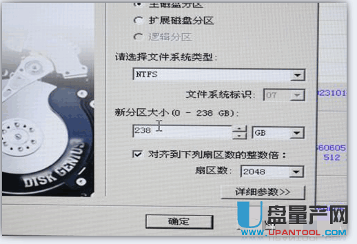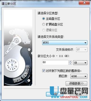 分区类型有两种,如果是装系统的分区,必须选主磁盘分区,分区大小选择你想要的大小,重点是,对齐勾选“到下列扇区数的整数倍”,然后在下面的扇区数选择4096,然后确定