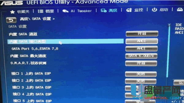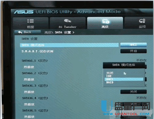 主板BIOS一直按着“Del键”可进入。上面就是华硕Z77主板BIOS内对SATA接口模式设置的画面,SATA接口模式设置的项目一般都在Advanced(高级)内。SATA模式有IDE、AHCI、RAID三种,选择AHCI模式。IDE模式不适合SSD使用,而RAID模式则是为需要组建磁盘阵列的用户准备的。