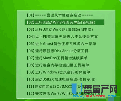 更改完bios后,插入u启动u盘启动盘重启进入装机界面,选择【02】运行u启动win8pe防蓝屏版,按回车键执行。