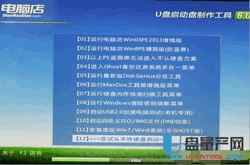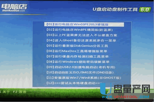 首先在电脑启动菜单或进入BIOS内设置U盘为第一启动盘,在主板BIOS中启动项--启动选项属性--选择启动的优先顺序。选择好后保存,U盘启动,开机即可进入下面的画面U盘里边的电脑店启动界面了。