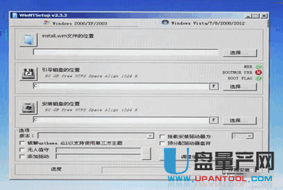 分好区后,点击PE桌面上的Windows安装工具,弹出WinNTSetup V2.3.3窗口,选择install.wim文件的位置。
