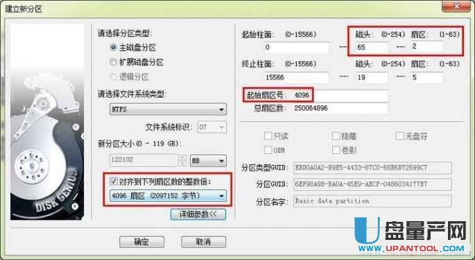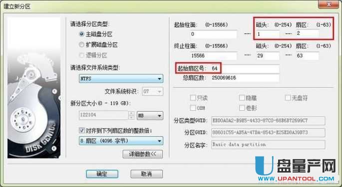 大家留意下图,用的diskgenius软件在分区的时候提示起始扇区为64,这是默认设置,很多第三方分区工具的默认值都是这个,这个起始扇区64意思是只能实现32K对齐,而不是4K对齐。