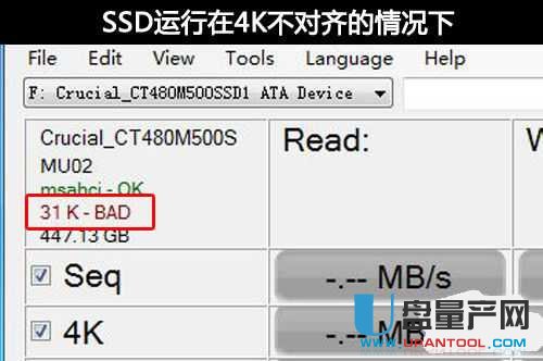 4K对齐对于SSD来说非常重要,我们测试证明,4K对齐与非4K对齐下,SSD的性能差距百分比在53%左右。也就是说,如果您的SSD不进行4K对齐,性能损失近一半。4K不对齐的情况下,AS SSD Benchmark软件的左上角同样会提示“BAD”的警示字眼。