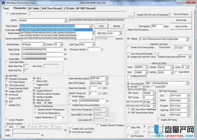 一个固态硬盘坏了,拆开看到主控是SM2258H,闪存是29f64b2amcmg2+29f32b2amcmg2,采用找到的SM2258H L06B版本的开卡软件,结果只能开MLC,而此盘是TLC的,所以无法开卡,后找到“SM2258H_B0KB_Q0125A”开卡软件,再次开卡就成功了,固件对了,量产就很简单了,里面有240G,256G两个版本,我用240G版本的开卡,设置的时候把内存设置改为128M,容量改为AUTO,开卡一次过。下面给大家开卡设置的截图供参考,开卡的时候需要短接ssd,需要usb转接sata的板子,或者移动硬盘盒子。