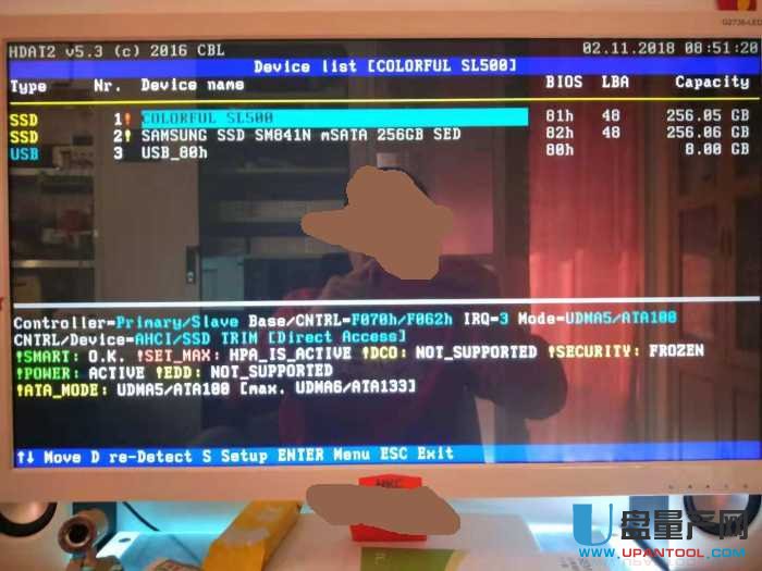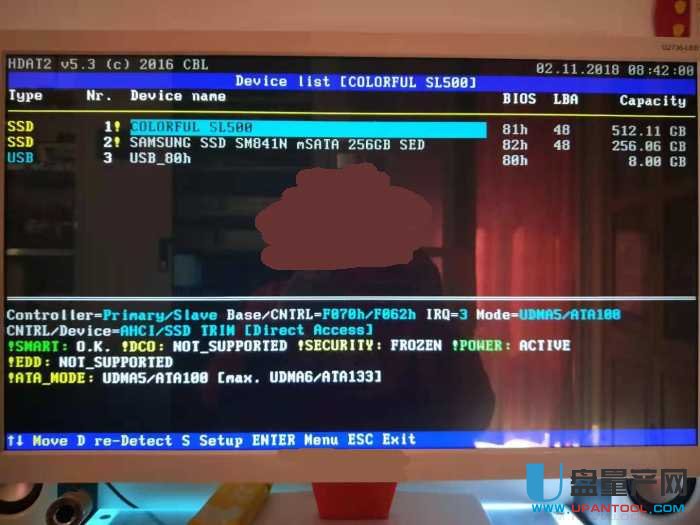 5、然后就进入HDAT2主界面,可以看到有两个固态硬盘,一个启动U盘,这里选择SL500固态硬盘并回车