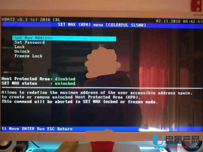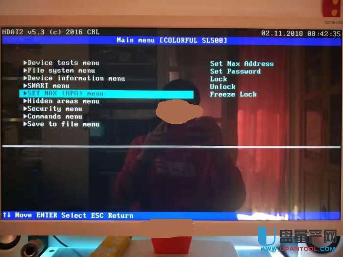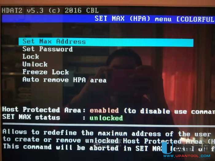 6、回车以后,显示出它的所有功能,选第五项,设置HPA地址功能,其他的我都搞不明白,甚至连这里面的SE操作都搞不成功,迫不得已才用PM做SE擦除的