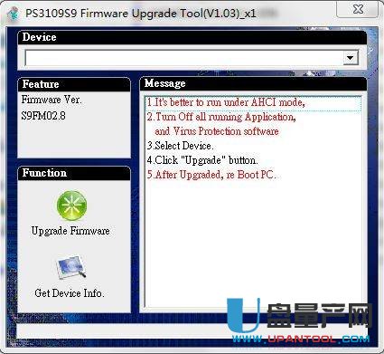 4、经过上面的折腾,电脑现在能识别ssd了,会发现新硬件,如下图,发现是ps3109 s9,我们打开win系统固件升级工具,打开里面的ps3109 S9的exe主程序,然后点击升级upgrade只需要几秒钟就升级成功了。这时候把固态硬盘断开电源,重新插上,就能识别到固态硬盘了,电脑的磁盘管理器里也能看到ssd容量了,我们正常分区格式化一下ssd就能正常使用了。