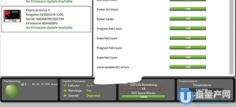 用金士顿固态硬盘管理工具可以看到smart数据还是告警了:剩余寿命只剩1%,预留块剩82%;