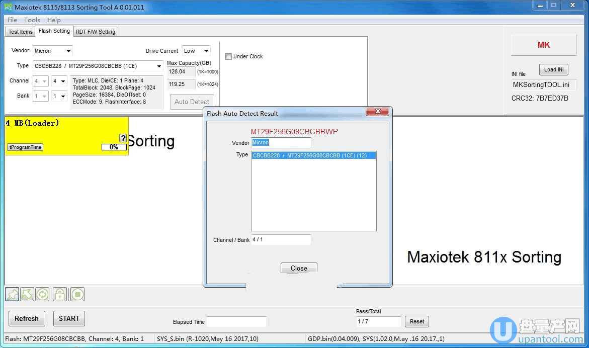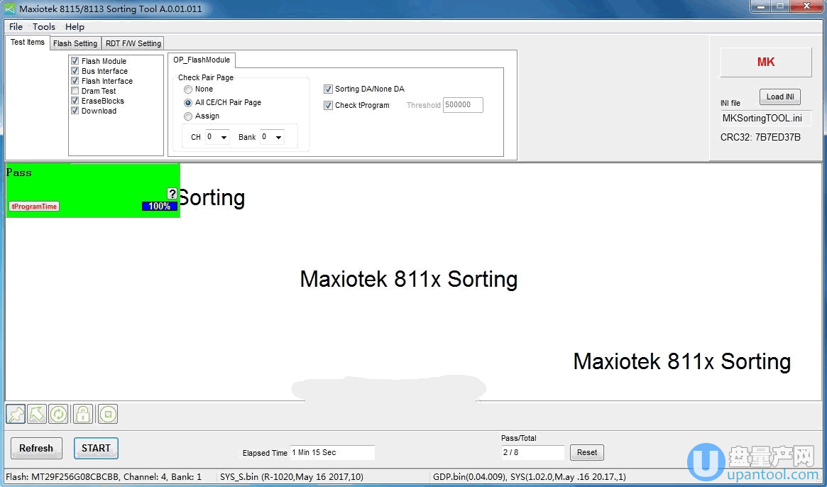 2、先用检测软件测试固态硬盘的闪存是不是有问题,把固态硬盘直接插电脑的sata接口上,也可以用移动硬盘盒子插usb口上,然后打开MKSorting811x,识别ssd后,如果没识别需要短接一下ssd上的短接点,然后点start开始测试,如下图测试结果无问题。