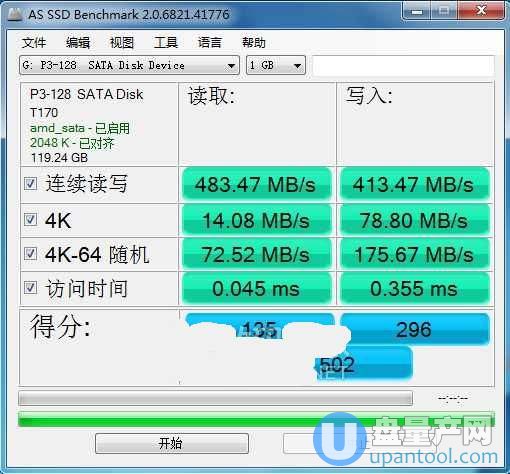 7、开卡成功后我们再拔插一下,用速度测试软件测一下ssd的速度,sata接口速度不错,如下图