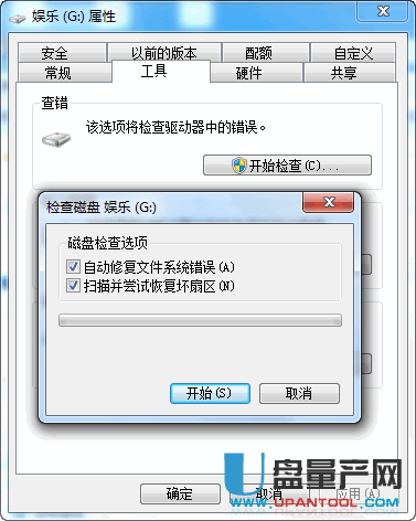 然后勾选扫描并尝试恢复坏扇区和自动修复错误两个选项,点击开始。