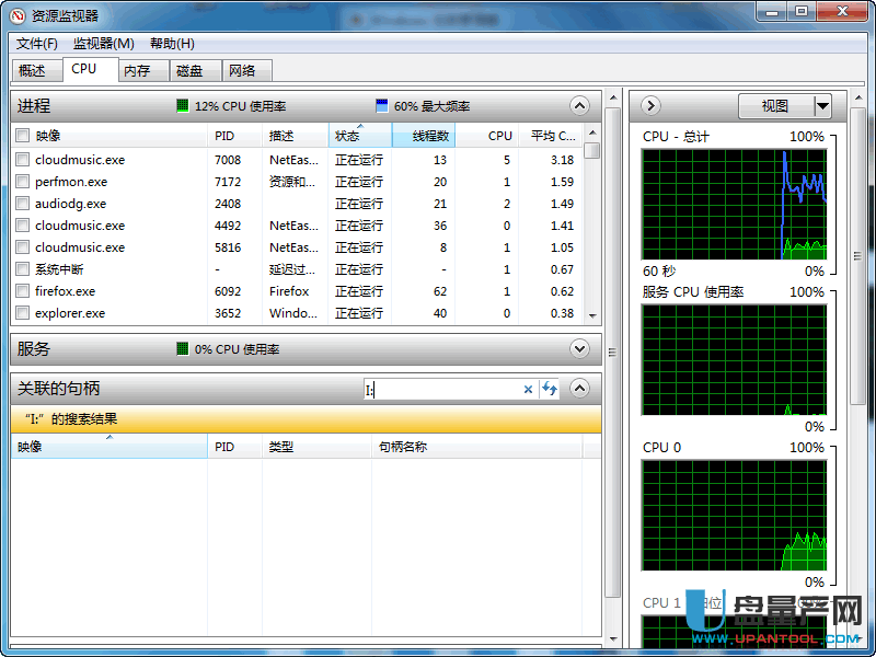 3.在打开的资源监视器窗口中,咱们切换到CPU这一栏中,然后找到下方的关联句柄,咱们在后方的搜索框中输入U盘的盘符,例如U盘是I盘,则输入“I:”,注意有冒号: