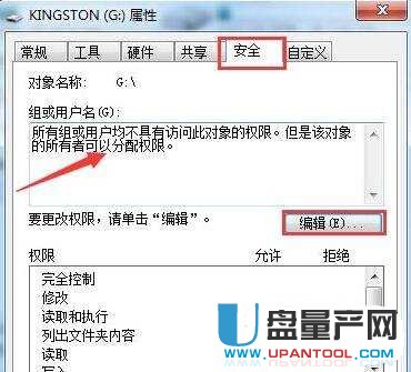 2、在属性窗口中点击“安全”选项卡,我们看到“组或用户名”显示没有访问的权限,这时我们点击“编辑”: