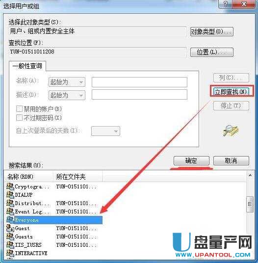 5、然后点击图中“立即查找”,下方搜索结果会显示所有用户名称,点击“everyone”,再点击“确定”即可。