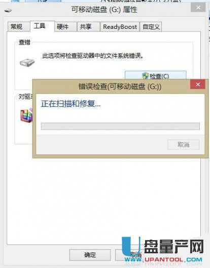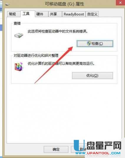 1、在u盘盘符上点击右键,然后在弹出的菜单选中属性,然后在弹出的菜单里找到工具并点击,然后点击”检测“按钮。