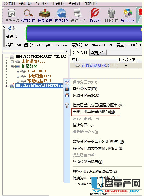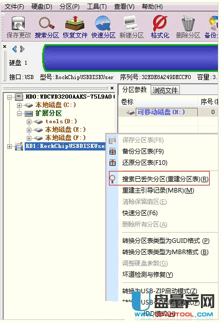 下载diskgenius软件,插上U盘并打开这个软件,然后选择U盘,注意别选到你的硬盘了,U盘一般可以看容量来区别,在U盘文字上点击鼠标右键,选择搜索已丢失的分区重建分区表选项。