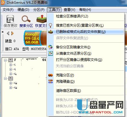 如果还是不行,那么我们就先恢复数据再说,依然用这款diskgenius,选中你的U盘,然后点击工具-已删除或格式化后的文件恢复选项