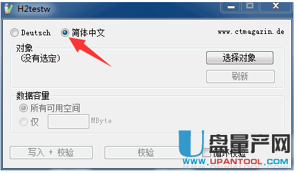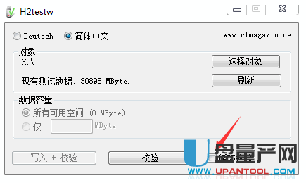 1、这个工具就是H2testw,使用方法是,下载后直接打开,插上U盘,有usb3.0的插3.0接口测试速度会快很多,如下图选择中文
