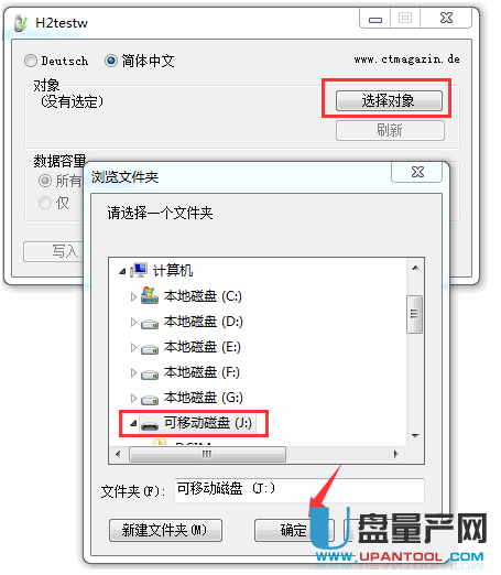 2、然后点击选择对象,选中你的U盘盘符,比如下图的J盘之后点确定