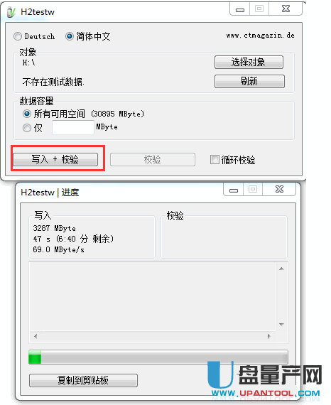 3、然后点击写入+校验按钮,就会开始检查U盘是不是扩容的了