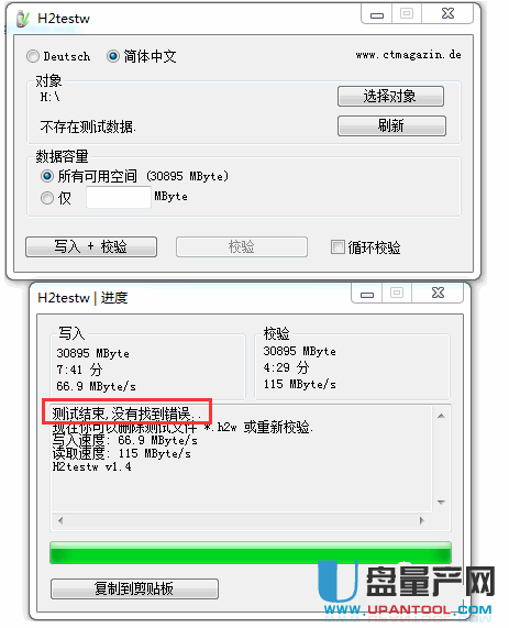4、等待检测完成后可以看到测试结果如图下,测试结束:没有找到错误,说明不是扩容的U盘,如果是结果显示错误,就说明是扩容U盘。