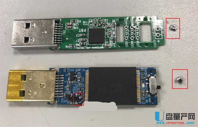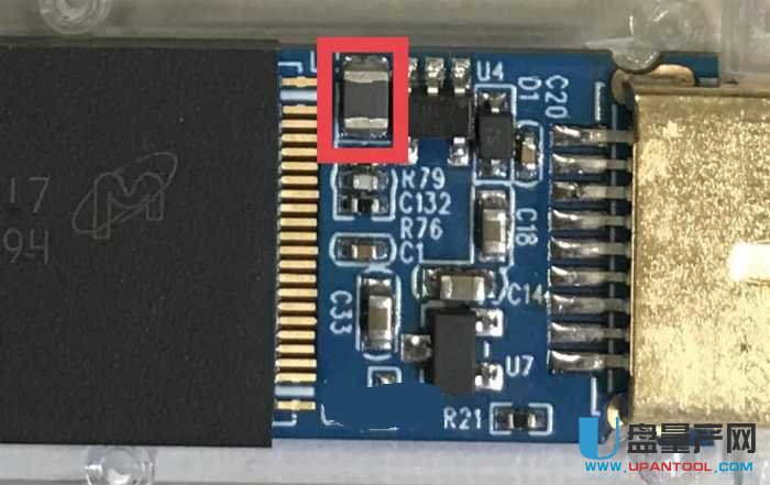 U盘拆开后,可以看到这个可能导致掉盘的电感位置在上图红框位置,把焊下来。