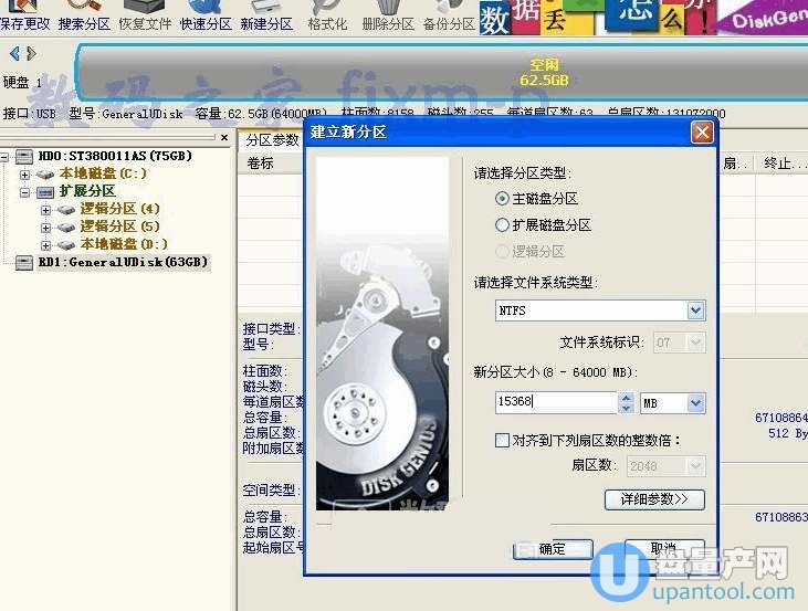现在我们再用diskgenius对U盘分区就能操作了,如下图,我们分出16G分区出来。