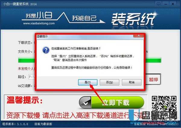 第四步、系统文件下载完成后软件弹出是否重启进行安装的提示框,确认安装则点击“是”,电脑将自动重启进行安装程序;