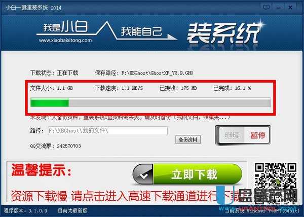 第三步、 软件开始自动下载你所选定的系统版本到本地最后一个磁盘的XBGhost目录下,建议安装完后不要删除,再次安装系统无需再次下载!小白重装工具默认支持最高2M以上下载速度,具体会根据客户端的网速不同而有差距,请各位用户耐心等待......