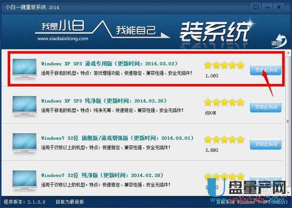 第一步 、下载小白一键重新系统双击打开,选择你需要安装的系统版本,内存2G的推荐使用xp,内存4G以上推荐win732位或WIN8 64位,这里以32位win XP系统安装过程为例;