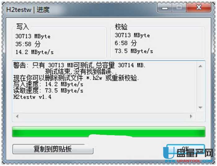 下面用H2testw看看是不是扩容卡,结果无问题,是在usb3.0的读卡器测试的,也能看到读取73M/S,写入14M/S。