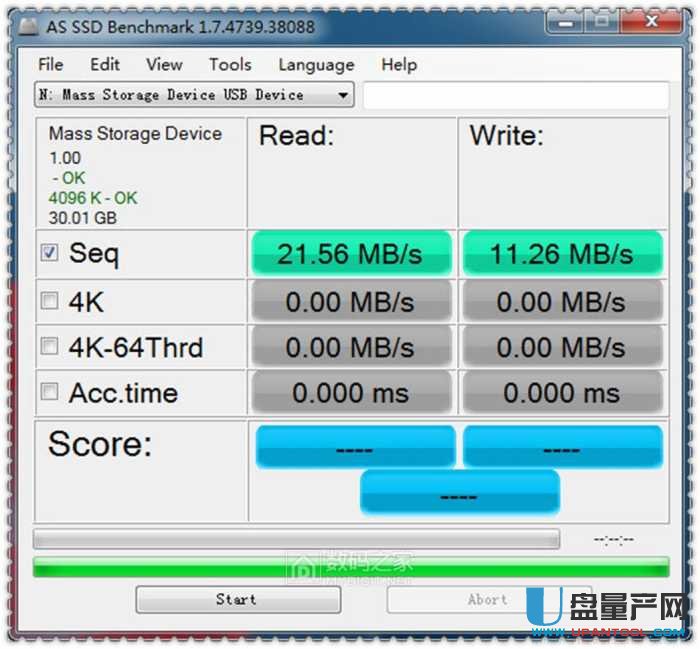 下面用AS SSD Benchmark测试一下在usb2.0读卡器下大文件的读写速度,可以看到默认4K对齐了,写入是11M/S,读取是21M/S。