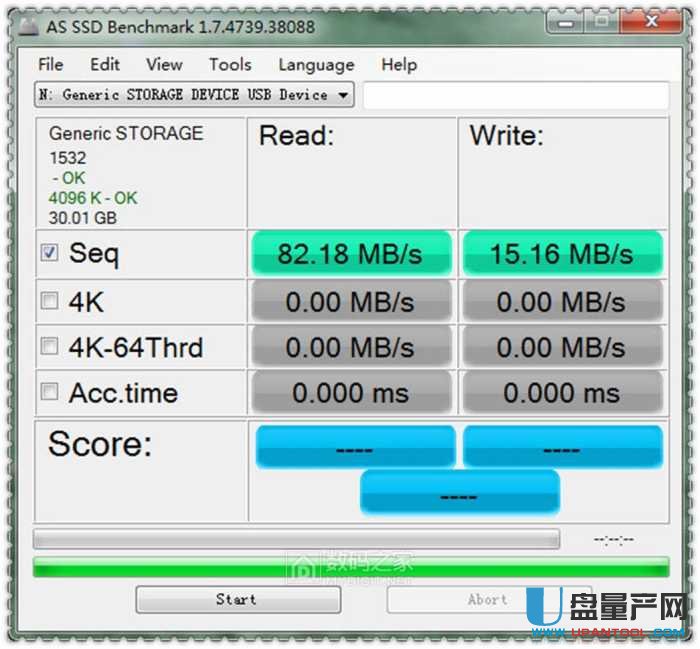 下面用as ssd测试下在usb3.0读卡器下的读写速度,可以看到读取是82M/S,写入是15M/S。