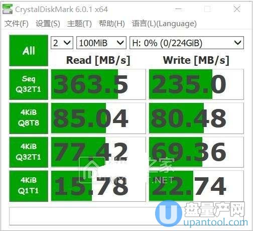 可以看到测试结果,usb3.0下的固态移动硬盘的确比机械的速度快多了,读取大文件363M/S,写入235M/S,4K文件的读写速度