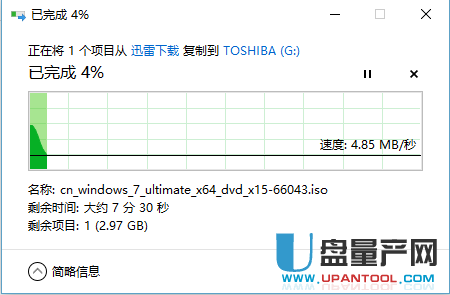 下面进行实际文件速度测试:文件大小:3.1G,基本上保持在5M/S左右的写入速度,USB2.0下算慢的。