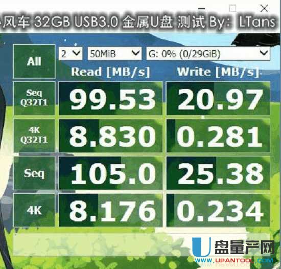CrystalDiskMark测试中,这款U盘的大文件写入速度在20.97M/s,读取速度为99.53M/s,测试结果和之前的系统和软件测试相仿。