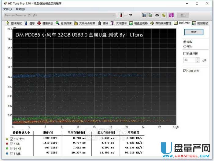 在HD Tune读取测试中,这款U盘的IOPS数据属于同容量、同价位U盘的中端的水平。