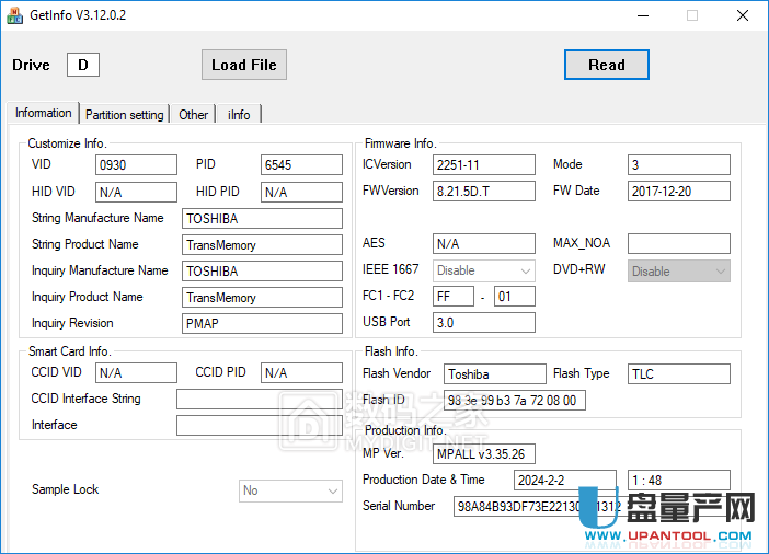 可以看到具体的主控和闪存信息了,还有量产工具版本为MPALL 3.35.26