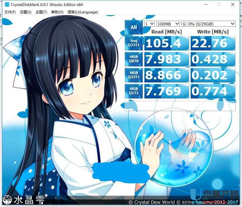 3、为了准确,再用crystalDiskmark测试一下U盘速度