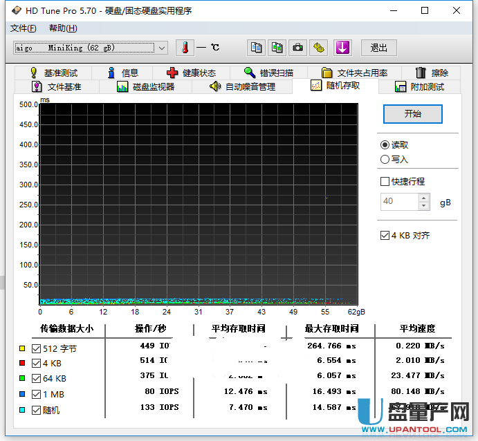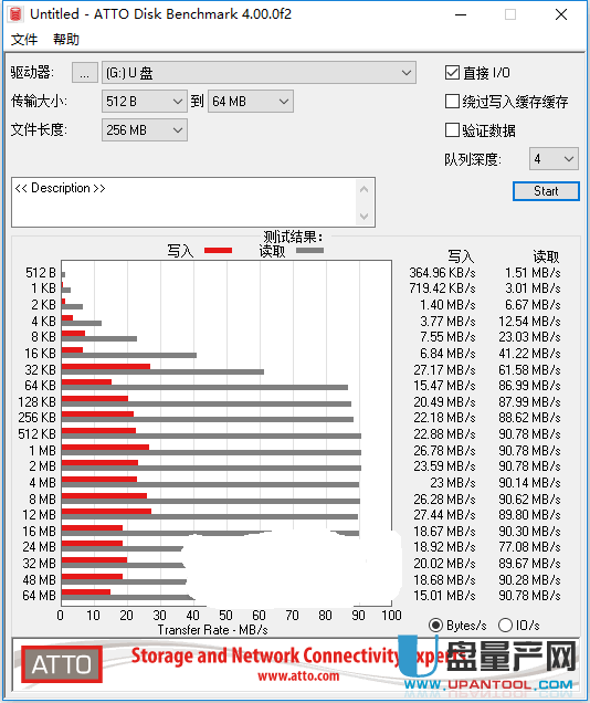 2、接下来测试一下U盘的读写速度,为了准确,我们采用多款测试软件,首先是ATTO测试结果
