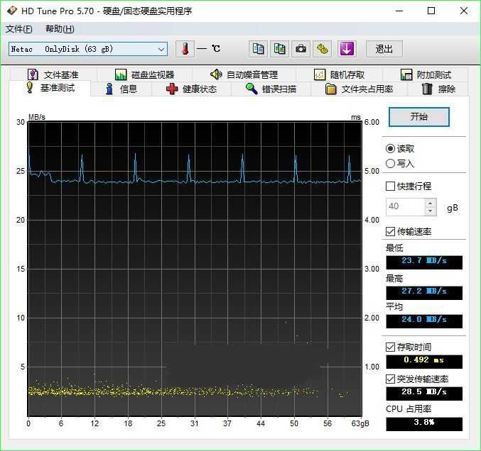 结果显示此U盘速度不算稳定,有相同频率的一个波峰,最低读取23M/S,最大读取27M/S。