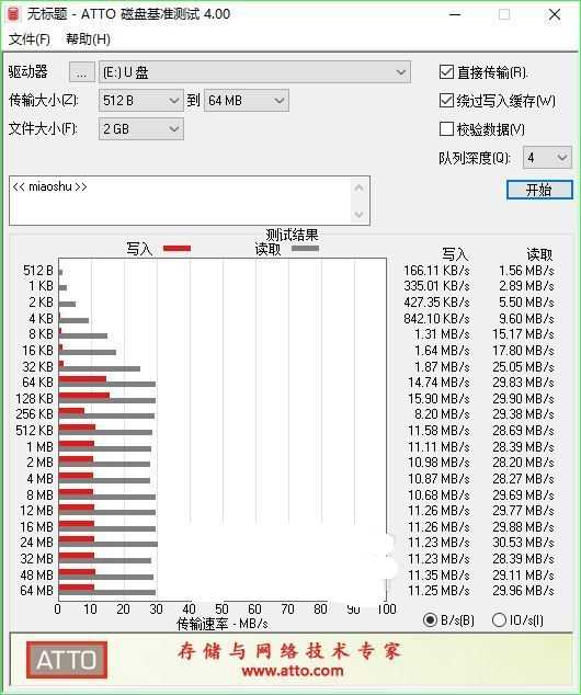 3、下面测试实际的读写速度,采用的软件是ATTO